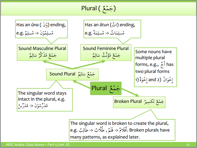 - State TRUE or FALSE: In the Arabic language sound masculine plurals and sound feminine plurals are under the main category of broken plurals.