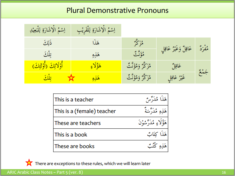 In the Arabic language broken plurals are treated as feminine singular. They are considered as feminine singular when referred by demonstrative pronouns, personal pronouns, relative pronouns and/or by verbs. In the below table, demonstrative pronoun تِلْكَ (that feminine singular) is used for referring nouns which are broken plurals. Knowledge of broken plurals will come by time. The reader should keep on observing them.