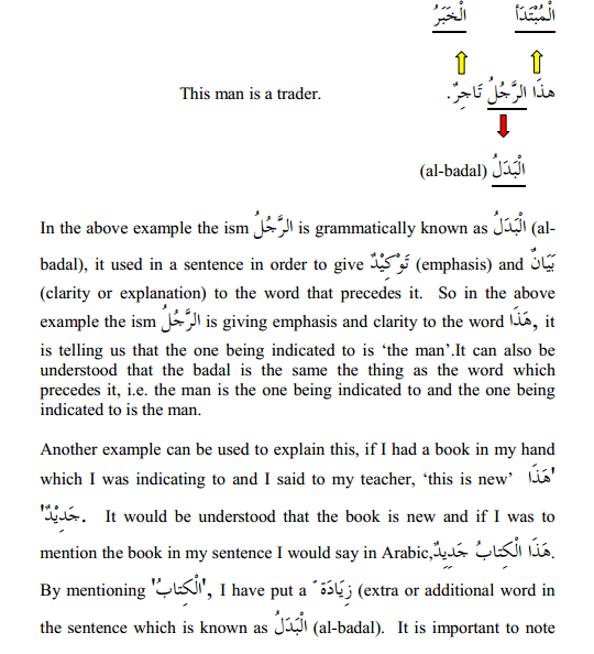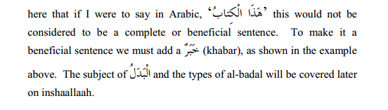Upon understanding it in English let us come to Arabic. The term “this” is هذا in the Arabic language. هذا is مَرفُوعٌ and definite by default. Book is substituting هذا. So book should also have same characteristics of هذا. So “this book” translates in the Arabic as