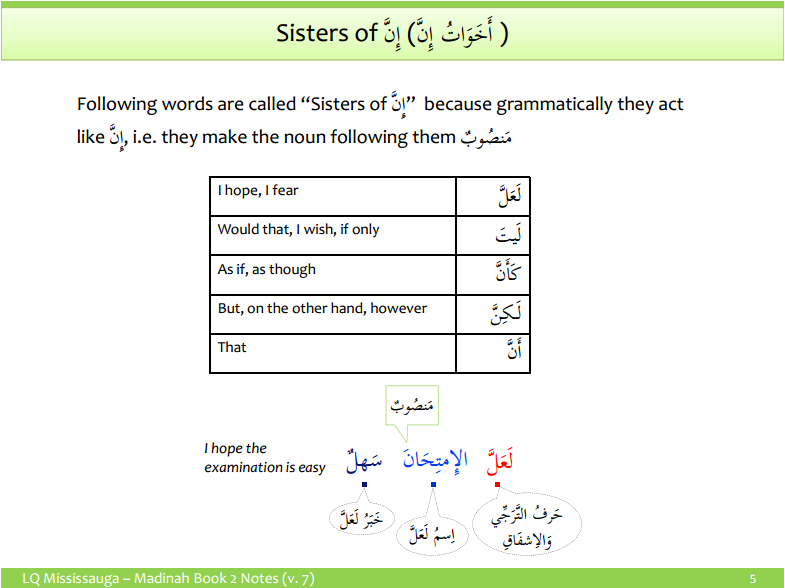 It’s translation is now “Indeed, he is mohammed”. Here the attached pronoun هُ in إنَّهُ is اسْمُ إِنَّ and it is مَــنْــصُــوْبٌ. Below table provides us the complete 14 combinations of إنَّ.