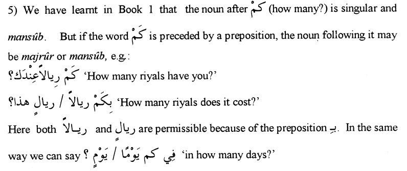Book 2 Concepts Kam كم Preceded by Preposition – تمييز can be majroor April 26, 2016April 26, 2016 Learn Arabic Source: Dr. V. AbdurRahim’s Book 2 – English Key – Chapter 9 Share this, Baarak Allaah Feekum Click to email a link to a friend (Opens in new window) Email Click to print (Opens in new window) Print Click to share on X (Opens in new window) X Click to share on Facebook (Opens in new window) Facebook Click to share on LinkedIn (Opens in new window) LinkedIn More Click to share on Reddit (Opens in new window) Reddit Click to share on Tumblr (Opens in new window) Tumblr Click to share on Pocket (Opens in new window) Pocket Click to share on Pinterest (Opens in new window) Pinterest Like Loading... Related Share this, Baarak Allaah Feekum Click to email a link to a friend (Opens in new window) Email Click to print (Opens in new window) Print Click to share on X (Opens in new window) X Click to share on Facebook (Opens in new window) Facebook Click to share on LinkedIn (Opens in new window) LinkedIn More Click to share on Reddit (Opens in new window) Reddit Click to share on Tumblr (Opens in new window) Tumblr Click to share on Pocket (Opens in new window) Pocket Click to share on Pinterest (Opens in new window) Pinterest Like Loading...